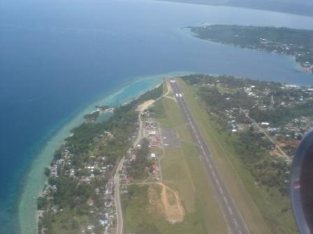 Pegunungan itupun kemudian berubah menjadi pemandangan laut, dan pesawat melakukan manuver turun. Agak seram, waktu mau landing, pesawat tu udah dekat bgt ma laut (kirain mu jatuh he3) baru kemudian mendarati landasan bandara. Fyuhhh... Lega.. Pesawat mendarat dengan aman. di Bandara rendani yang hanya berjarak 7 km dari pusat kota Manokwari dan letaknya di pinggir laut ini. Turun dari pesawat saya mengikuti penumpang yang lainnya. Tentunya kondisinya berbeda dengan beberapa bandara yang pernah saya jumpai. Saya harus mengambil tas saya di sebuah gedung yang letaknya berdampingan dengan terminal keberangkatan. Setelah sudah nyari2 tas, ada satu karton barang tidak ada, saya lapor ke petugas bahwa barang saya di bandara marauke, sehingga saya mengambil barang yang ketinggalan tadi esok harinya.